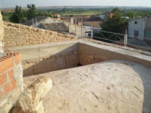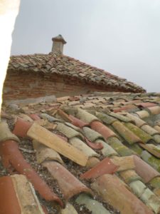 En cuanto al estado físico que nos encontramos antes de intervenir desde nuestro estudio, se observaban principalmente daños en las cubiertas, en las que existían gran cantidad de tejas rotas, desplazadas y falta de éstas. En los rafes encontramos tejas con posibilidad de caída que se debían retirar. Así mismo, existían flechas en algunas zonas de los planos de la cubierta, probablemente consecuencia de deformaciones por flecha de los rollizos de madera que formaban su estructura.