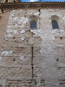 El acceso parece haber sido construido en dos fases bien diferenciadas. La primera sigue la línea constructiva del resto de la iglesia, combinando fábrica de ladrillo manual y tapial de ladrillo. La segunda corresponde a una intervención posterior, realizada en fábrica de mampostería. Esta situación generó cierto debate, pero el criterio de intervención estaba claro desde el principio: la solución debía respetar y reflejar ambas fases constructivas, por lo que no era viable aplicar un tratamiento unificador.