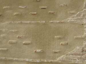 Finalmente, se tuvo que tomar una decisión importante respecto al uso de mallas, recomendadas por la casa de cales. Varios factores nos llevaron a descartar su utilización, siendo el principal el sistema de anclaje necesario para fijarlas. Consideramos que ningún tipo de anclaje era compatible con la fábrica de tapial con la que trabajábamos, y que, en caso de fallo, el desprendimiento del revoque podría comprometer todo el paño de fachada.