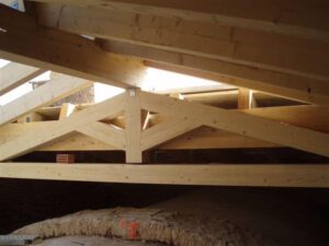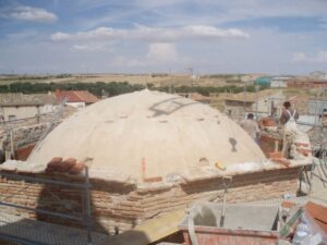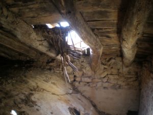 La restauración de las cubiertas consistió en la retirada de la totalidad de los elementos de cobertura (tejas), soporte (cañizos y yeso) y toda la estructura de rollizos que componía la cubierta.