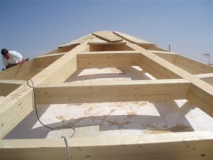 Después de ejecutados los zunchos y encamisados de bóvedas y cúpula se construyó una nueva estructura, idéntica a la original(vigas y correas), pero en secciones de madera laminada estructural. Sobre ésta, se dispuso entablado de cubierta, con tablas de madera canteada